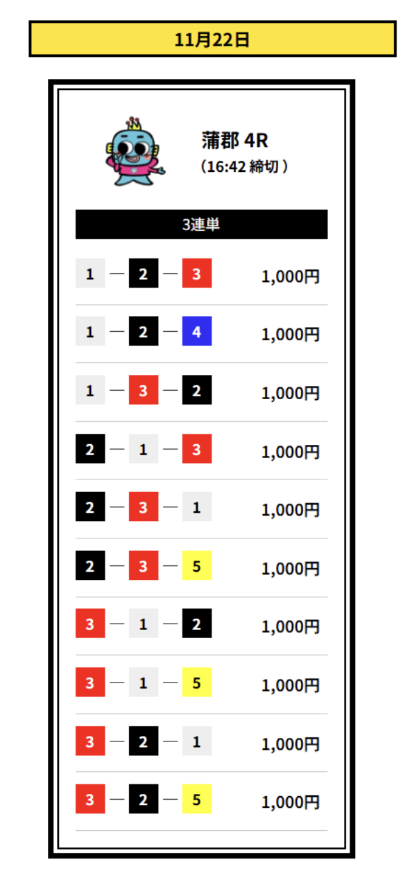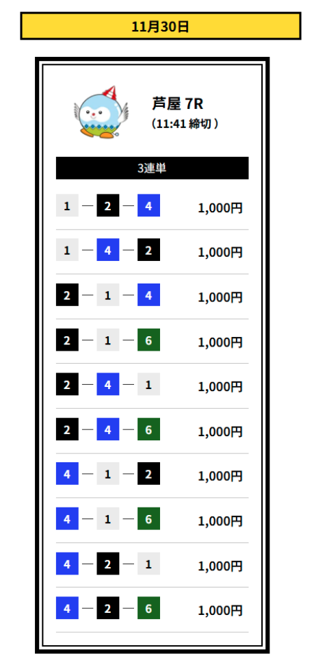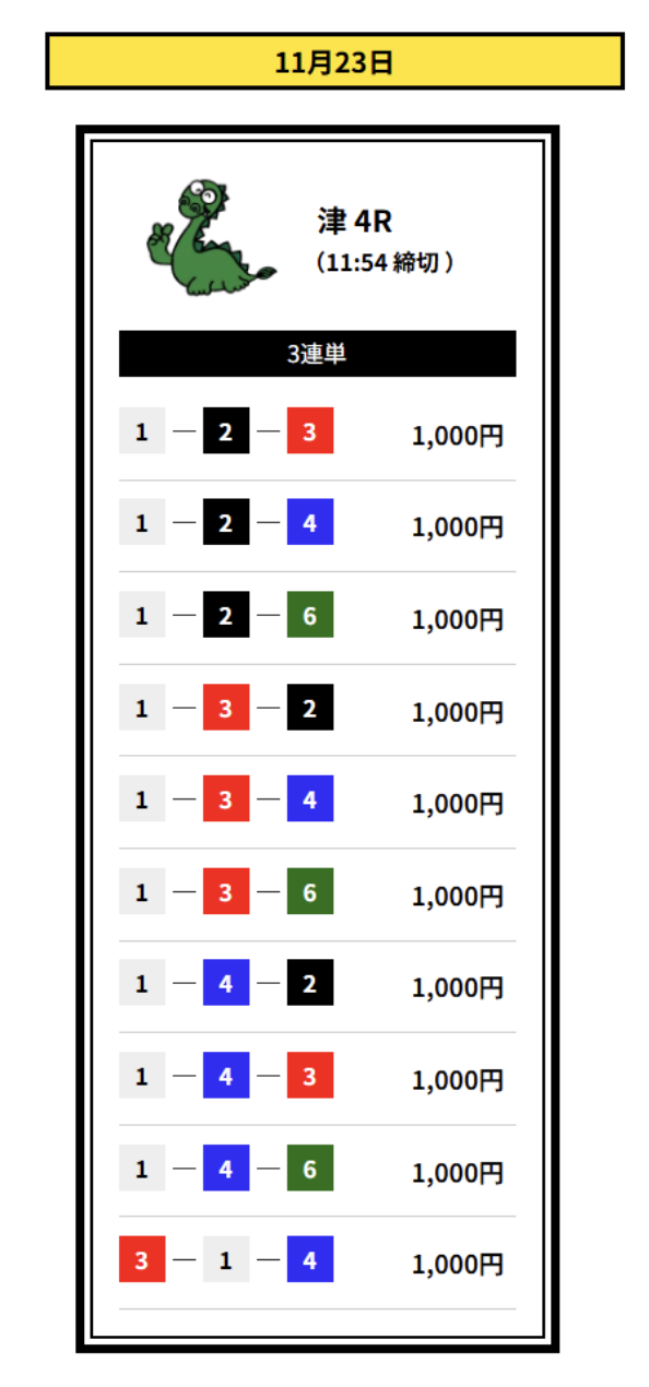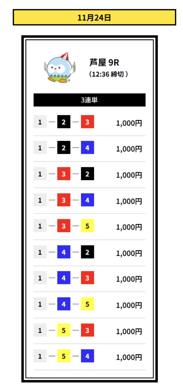 2着には2・3号艇を配置して、堅実なイン逃げパターンを想定した買い目です。