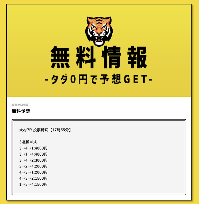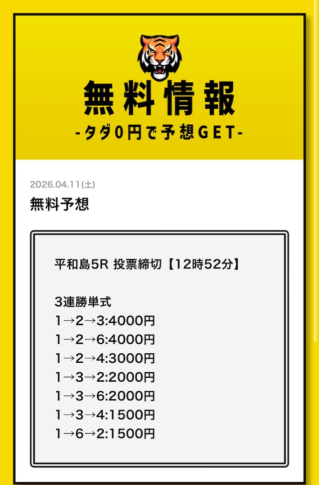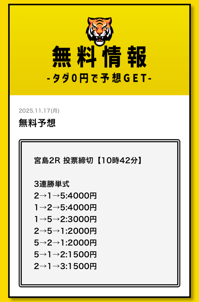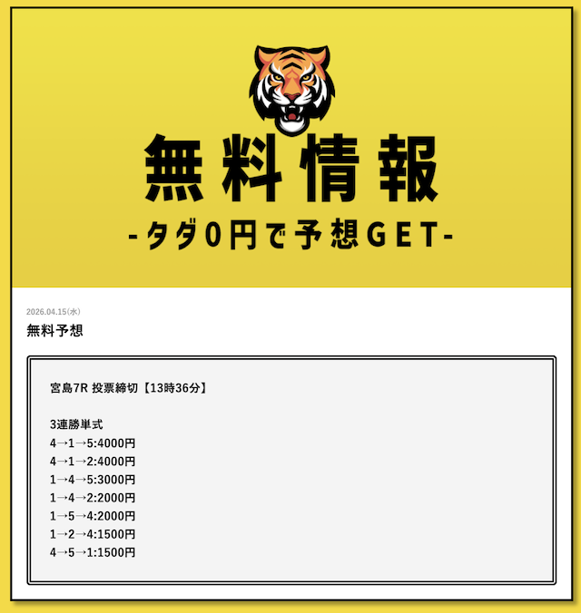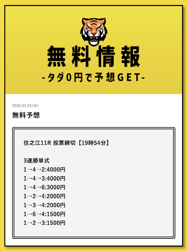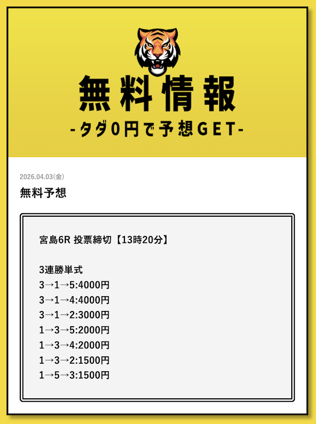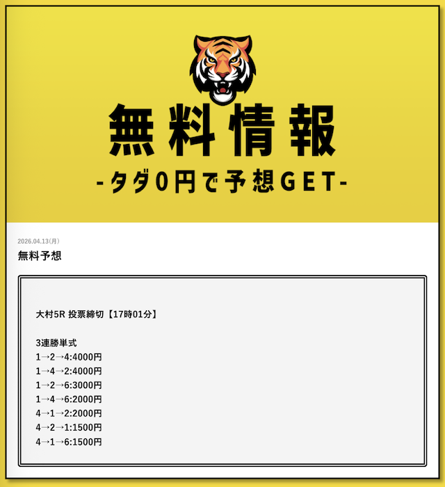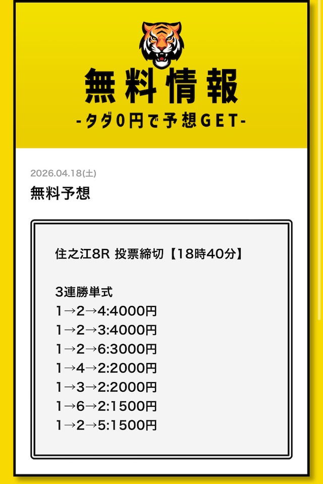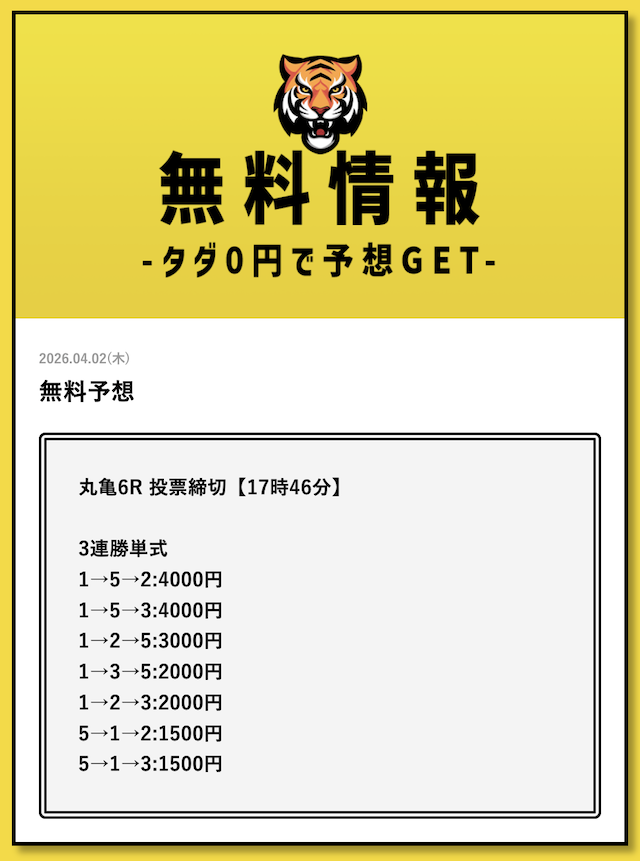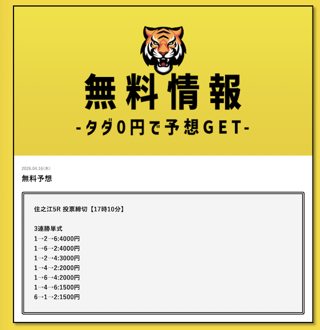 まずは無料予想でタイガーボートの分析力を確認し、その精度に納得してから有料予想に移行してみてください。
