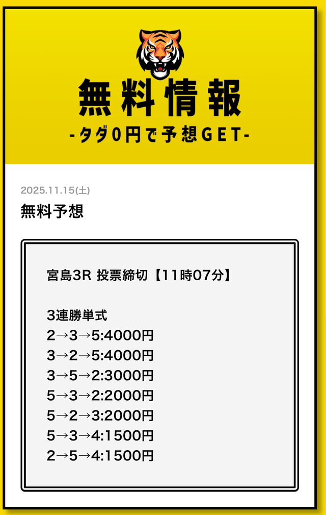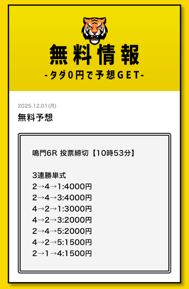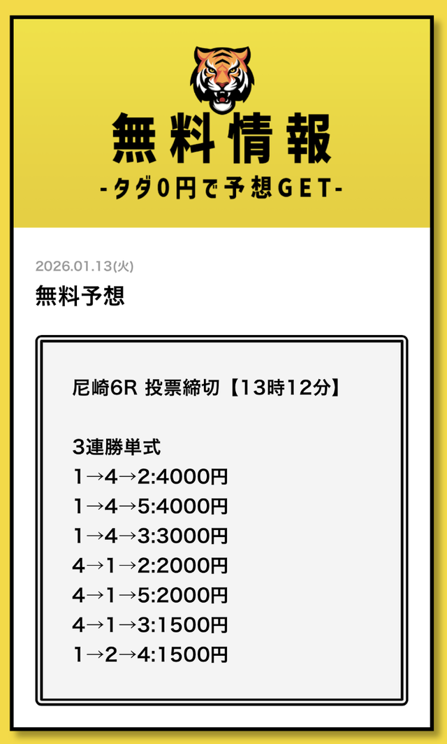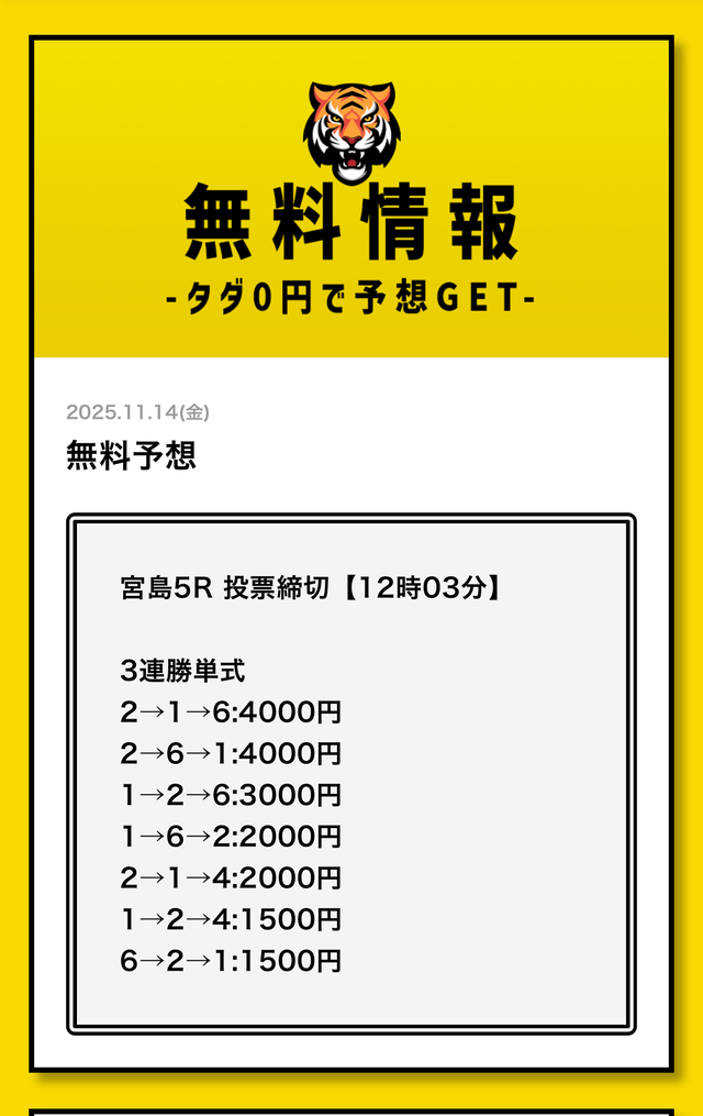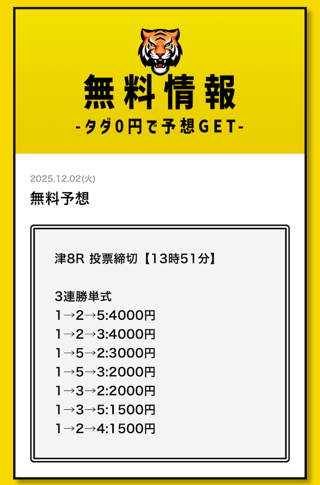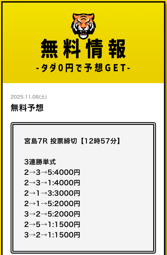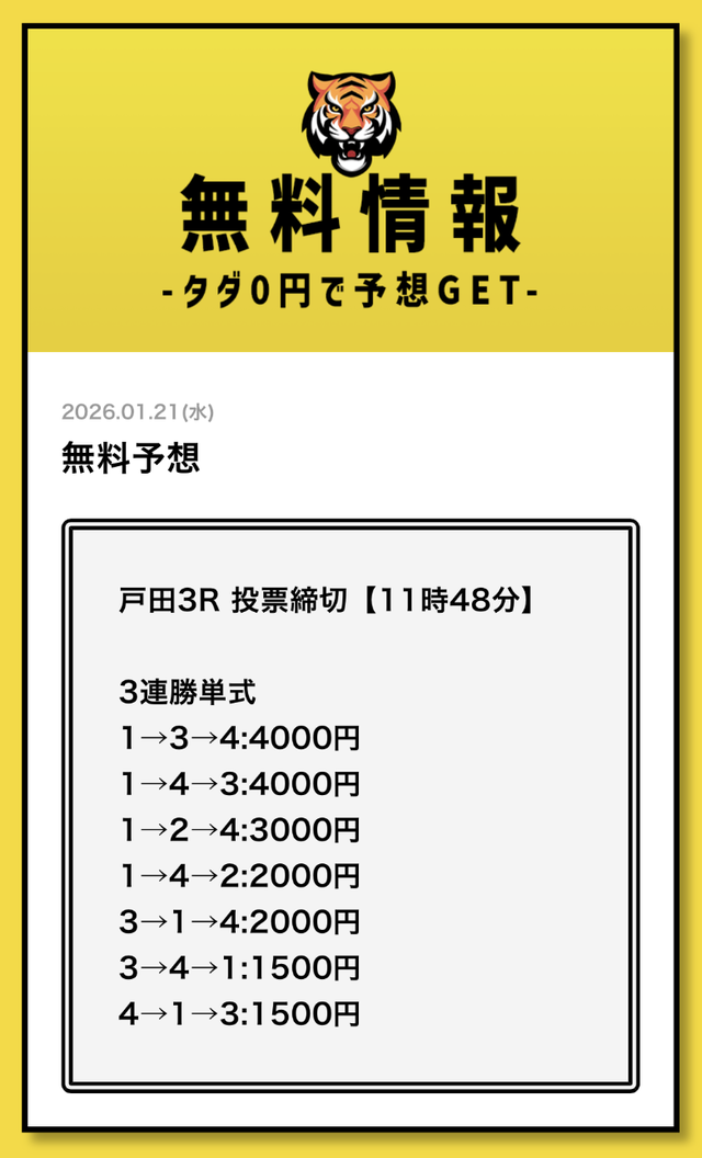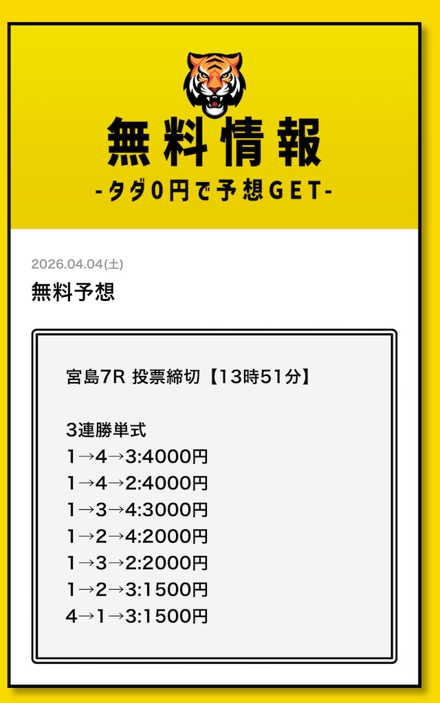まずは無料予想でタイガーボートの分析力を確認し、その精度に納得してから有料予想に移行してみてください。