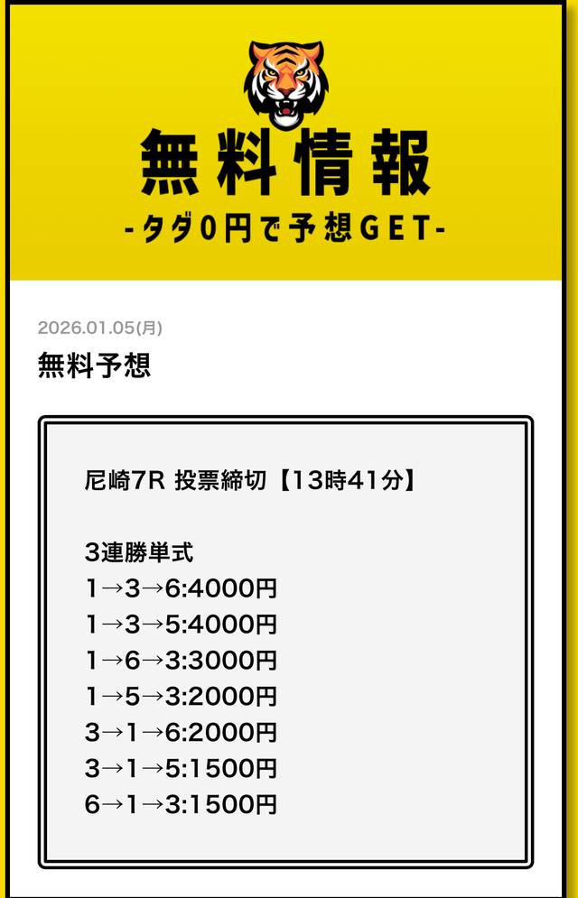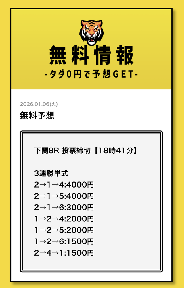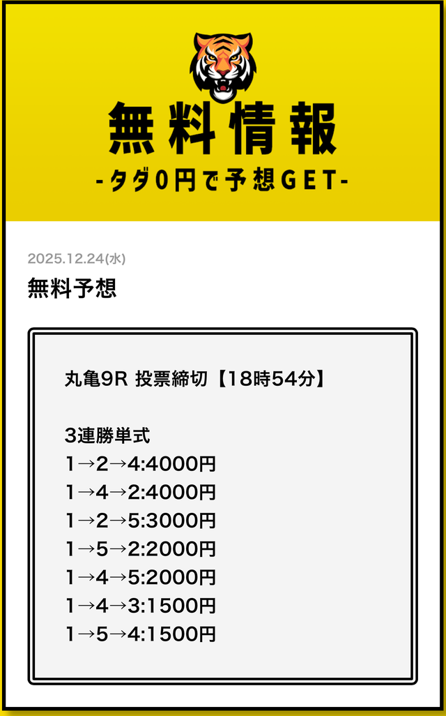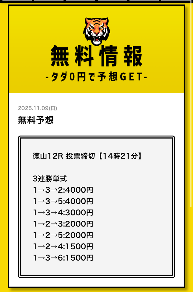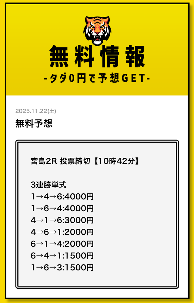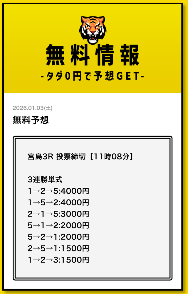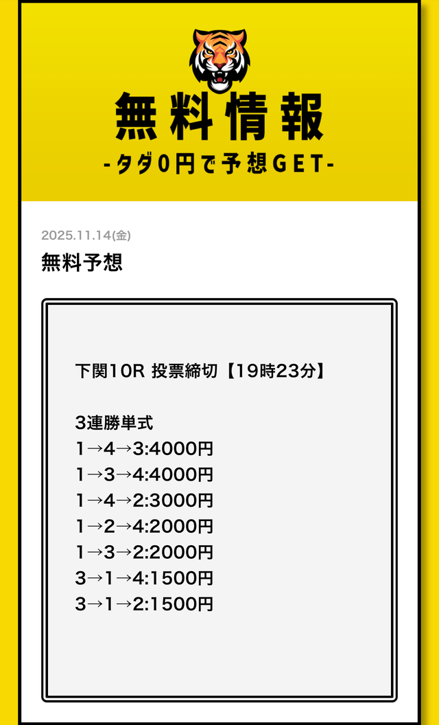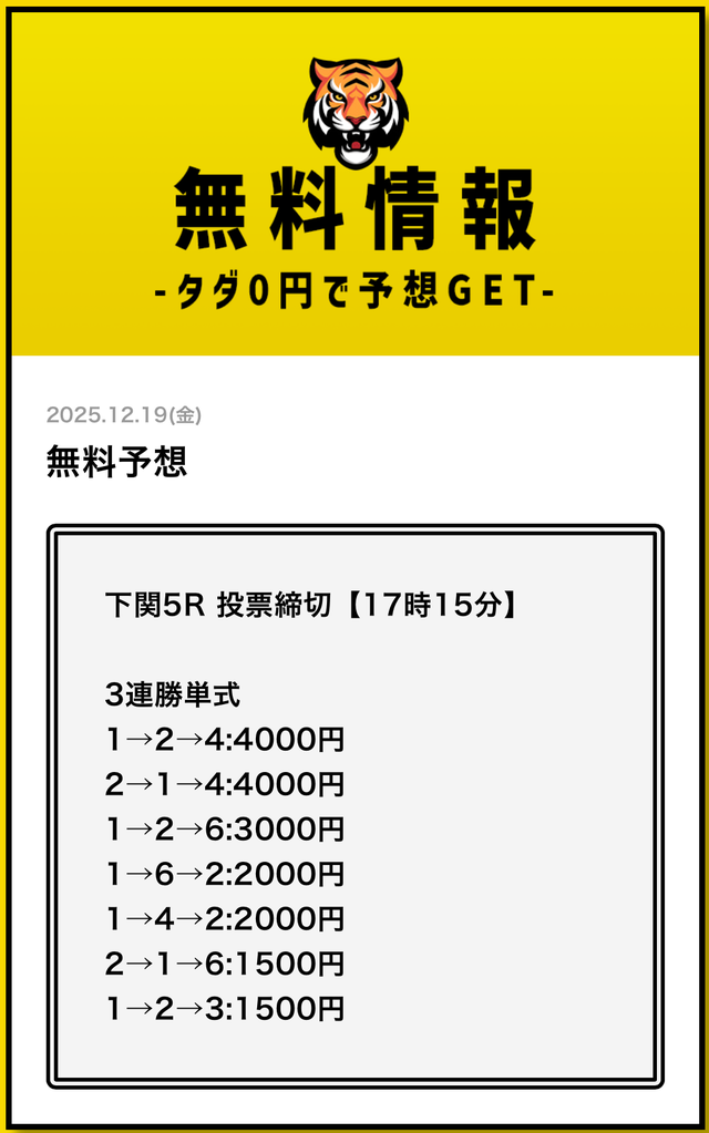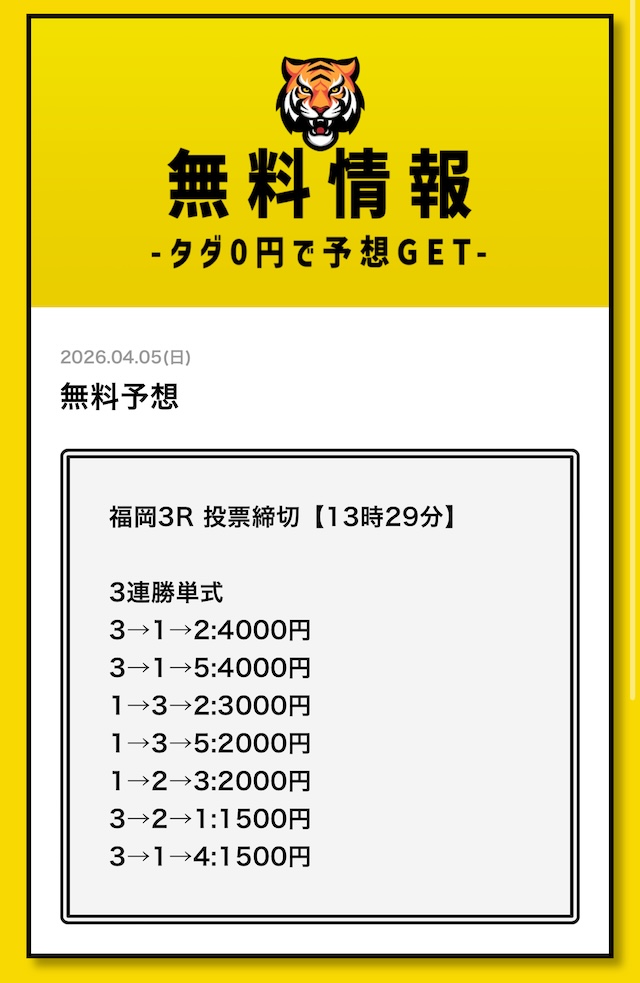 まずは無料予想でタイガーボートの分析力を確認し、その精度に納得してから有料予想に移行してみてください。