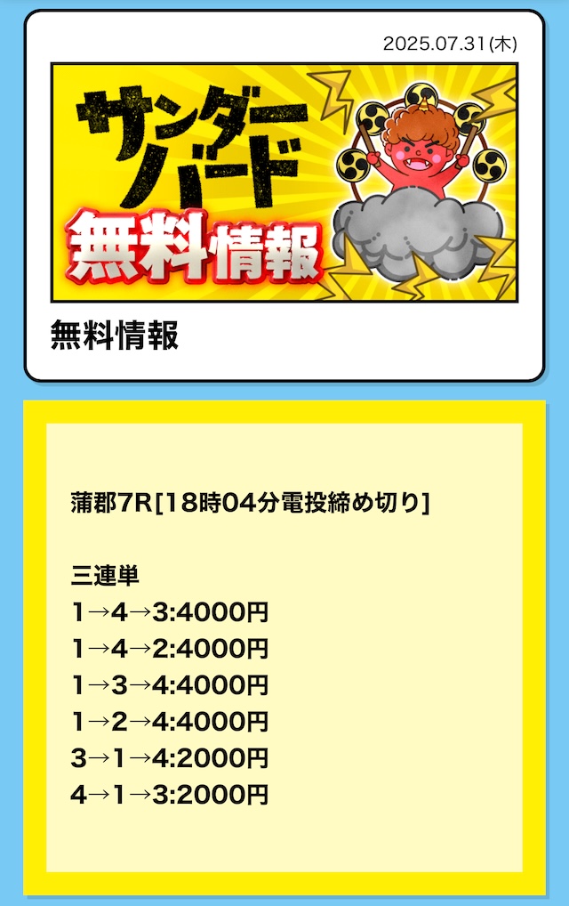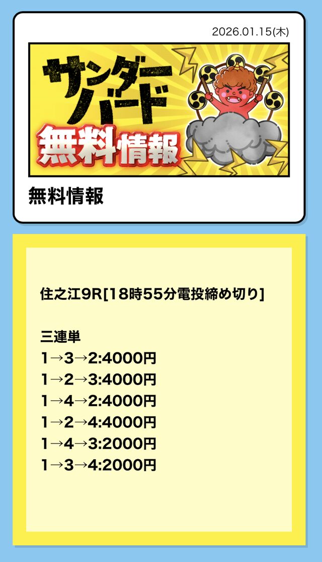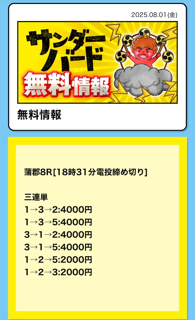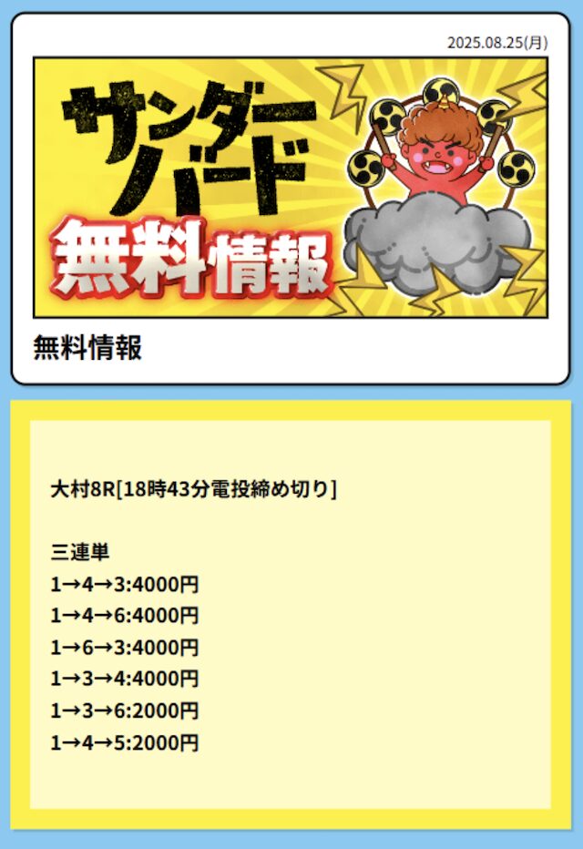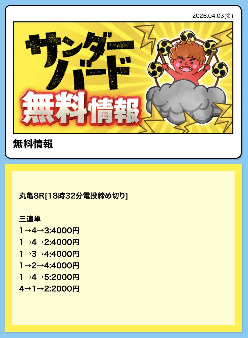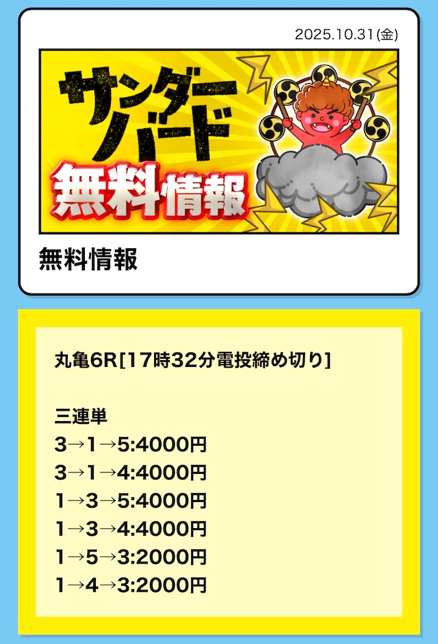 競艇サンダーバードの有料予想「100pt情報」の結果を共有します。