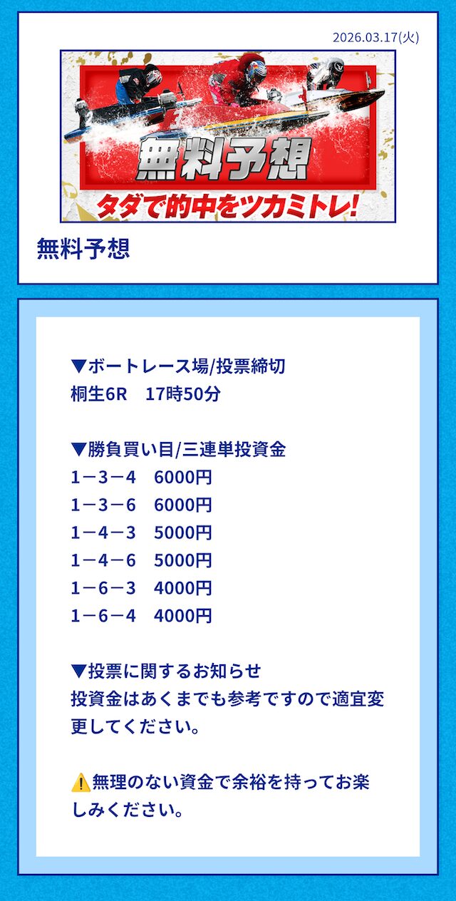 ツカミトレの無料予想は、3連単・6点固定のシンプルな買い方です。