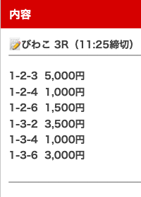 | 平均払戻 | 33,540円 | 54,890円 | 34,520円 | 24,300円 | 46,530円 | 38,970円 | 28,570円 | 8,600円 | 29,430円 | 18,034円 | 37,630円 | 15,600円 | 50,928円 | 24,300円 | 47,181円 | 21,540円 | 37,922円 | 17,672円 | 29,860円 | 9,311円 | 14,557円 | 45,795円 | 19,994円 | 19,282円 | 15,533円 | 9,225円 | 15,389円 | 40,444円 | 17,432円 | 36,434円 | 19,625円 | 15,330円 | 25,734円 | 13,000円 | 43,064円 | 16,882円 | 28,176円 | 43,210円 | 11,800円 | 18,865円 | 18,887円 | 28,323円 | 17,123円 | 9,485円 | 13,376円 | 18,246円 | 17,549円 | 15,807円 | 17,738円 | 29,433円 | 23,686円 | 20,334円 |