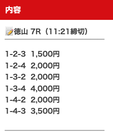 | レディース | 7戦 | 85.7% | 237.3% | 144,200円 |