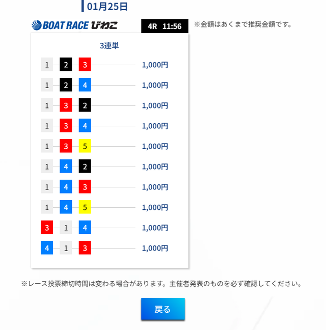 | 1月25日 | びわこ4R | 三連単 | 10点 | 10,900円 |