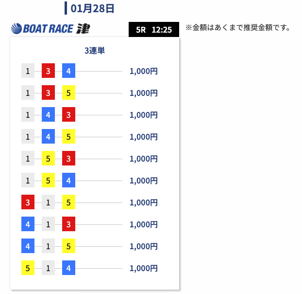 | 1月28日 | 津5R | 三連単 | 10点 | 0円 |