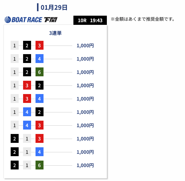 | 1月29日 | 下関10R | 三連単 | 10点 | 20,300円 |