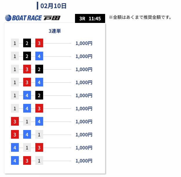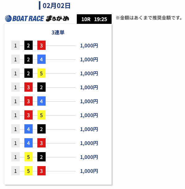 | 2月2日 | 丸亀10R | 三連単 | 10点 | 10,900円 |