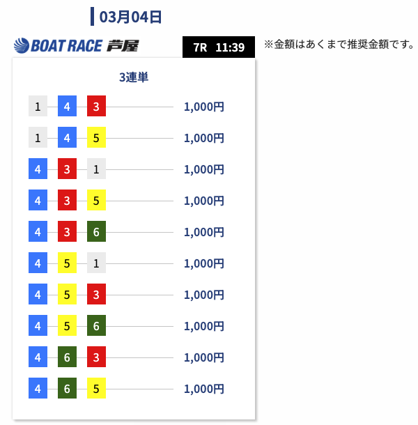 | 8月18日 | 浜名湖4R | 三連単 | 7点 | 22,100円 |