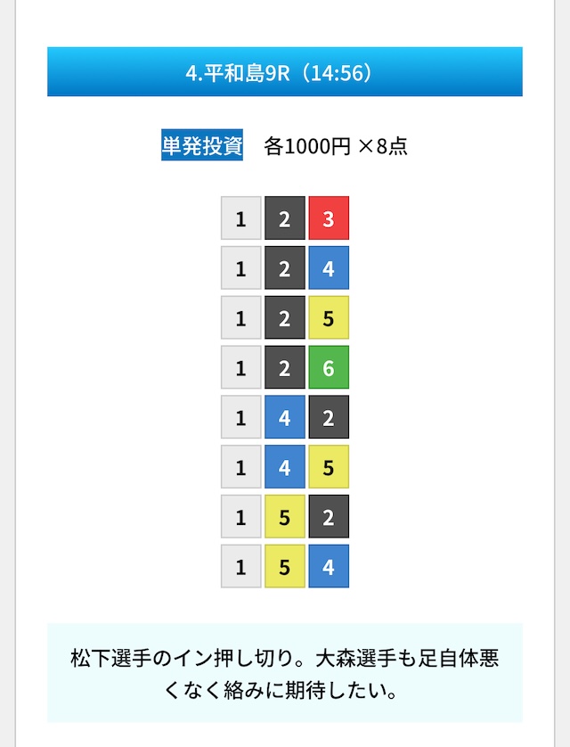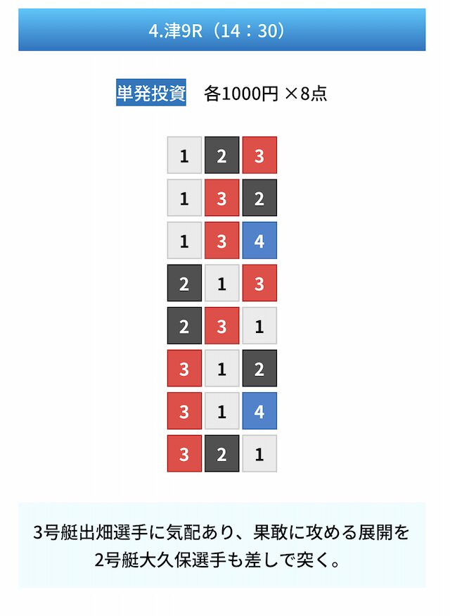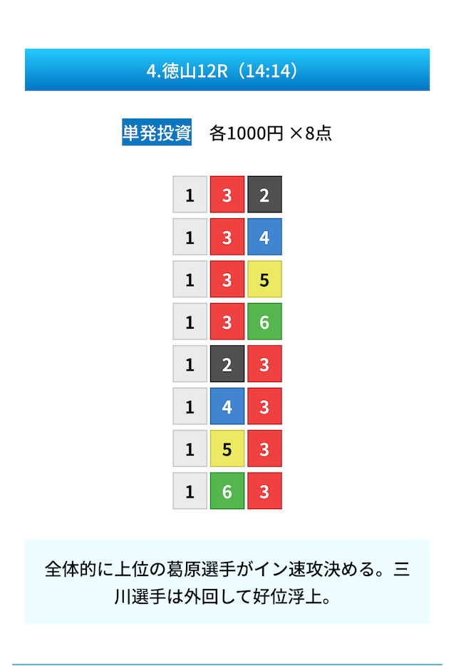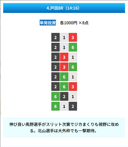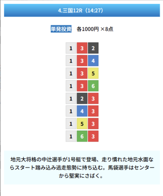 | 9月16日 |  三国12R |  三連単 |  8点 |  8,500円  |