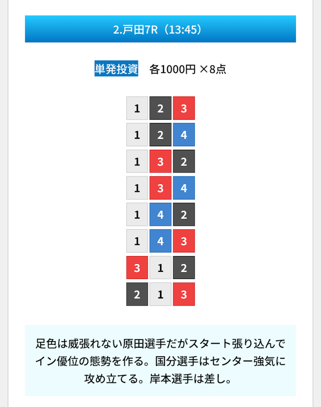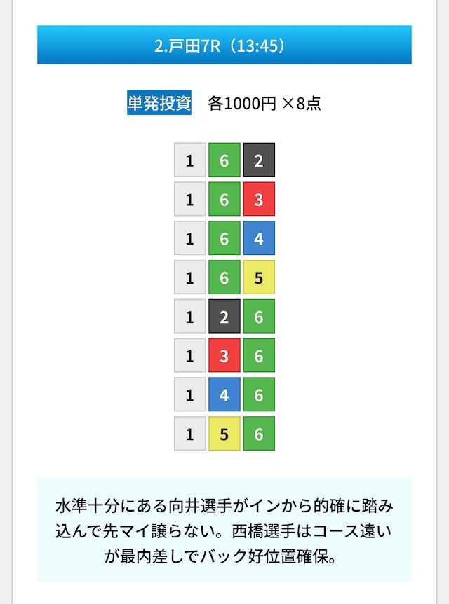 | 10月8日 |  戸田7R |  三連単 |  8点 |  23,100円  |