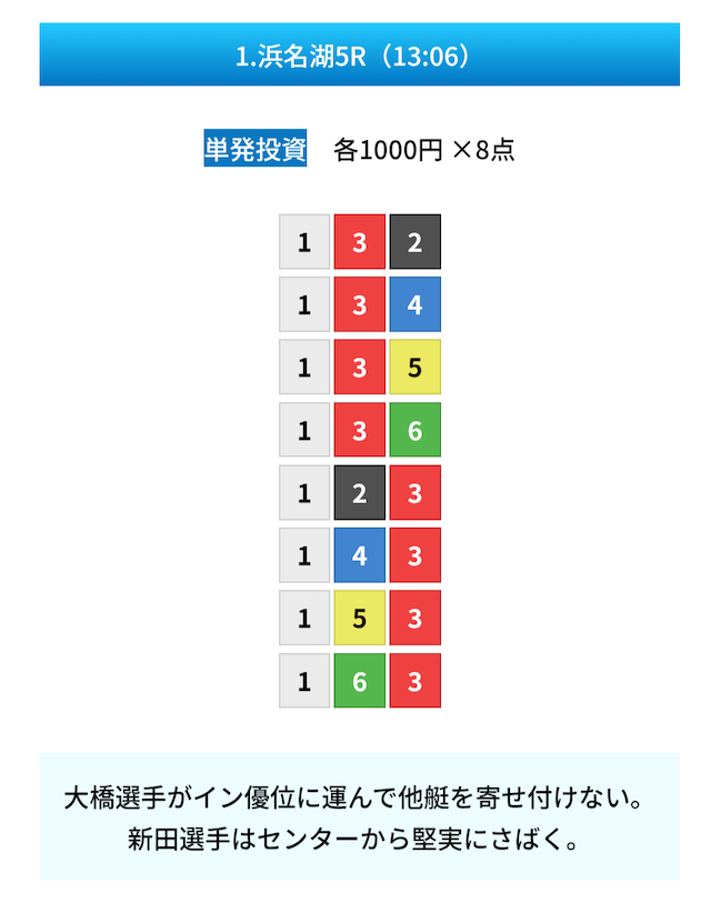 | 10月12日 |  浜名湖5R |  三連単 |  8点 |  10,900円  |
