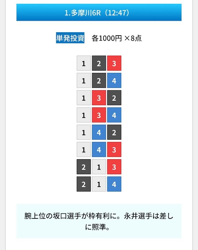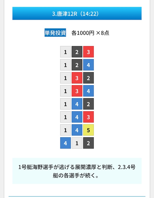 | 8月12日 |  唐津12R |  三連単 |  8点 |  14,600円  |