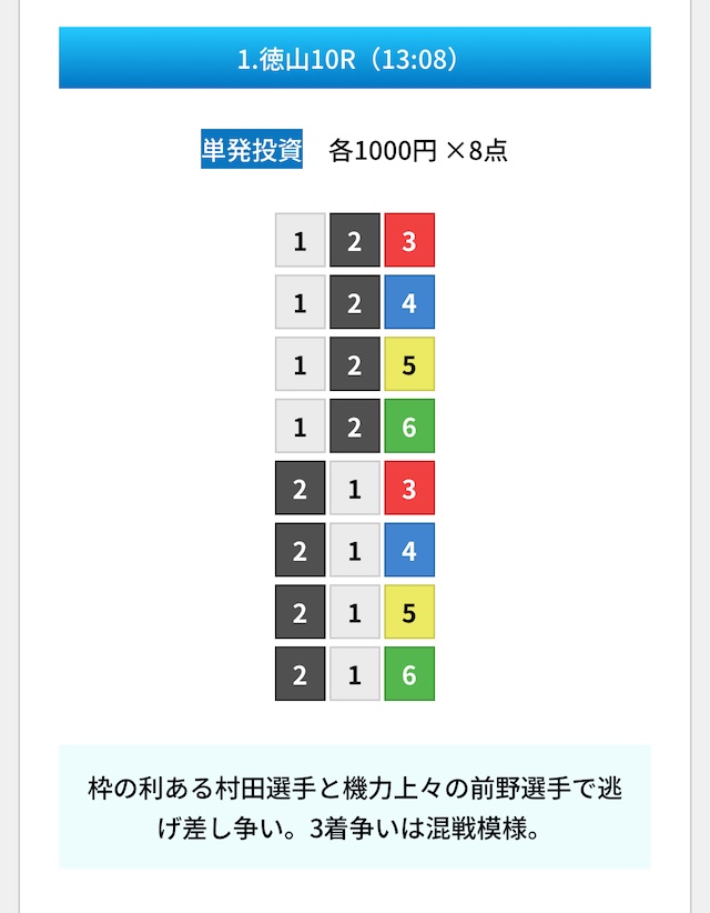 | 10月15日 |  徳山10R |  三連単 |  8点 |  26,800円  |