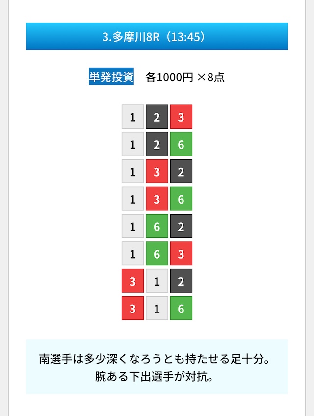 | 10月20日 |  多摩川8R |  三連単 |  8点 |  16,700円  |