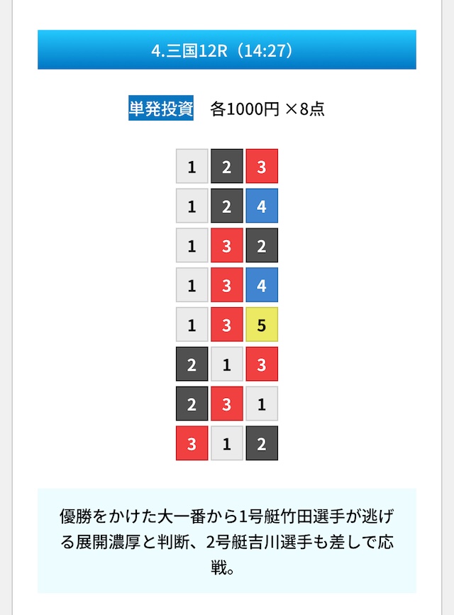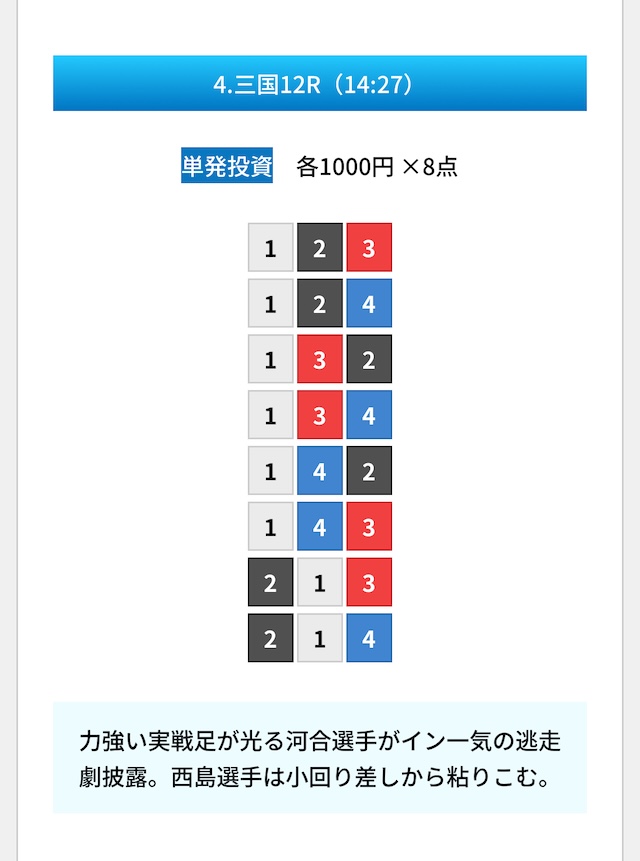 | 10月22日 |  三国12R |  三連単 |  8点 |  8,200円  |