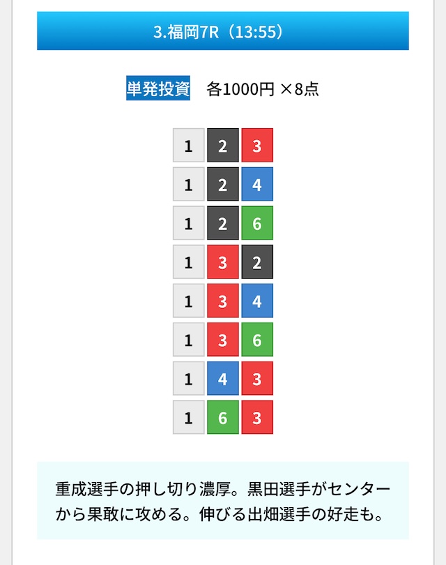| 9月12日 |  福岡6R |  三連単 |  8点 |  13,000円  |