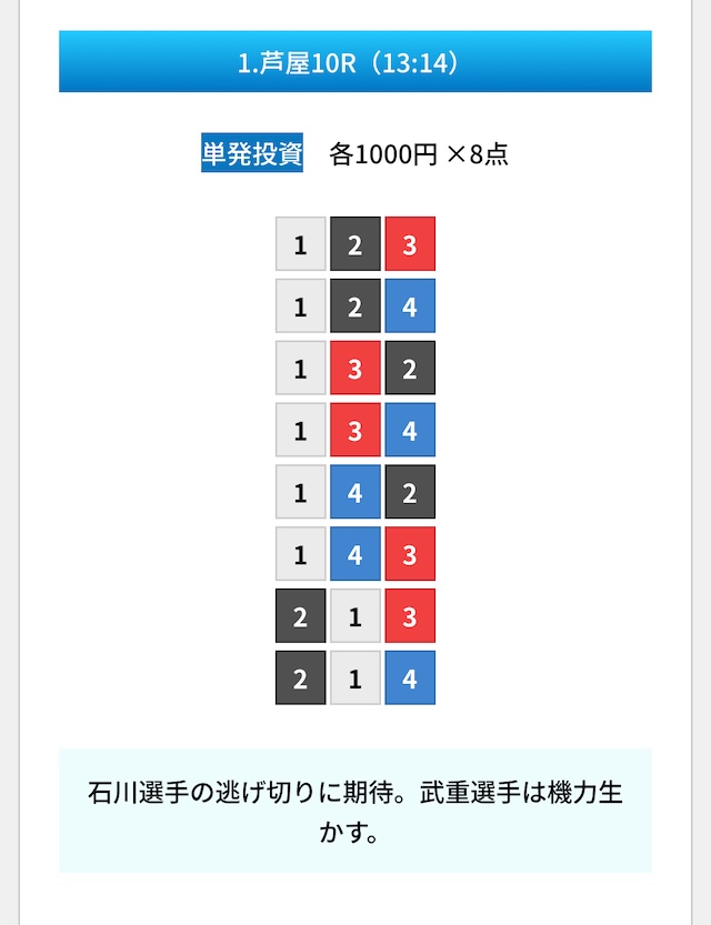| 8月16日 |  芦屋10R |  三連単 |  8点 |  10,800円  |