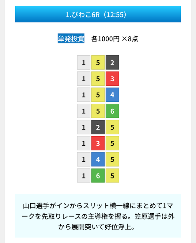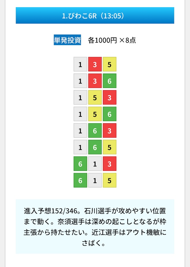 | 8月15日 |  びわこ6R |  三連単 |  8点 |  8,600円  |