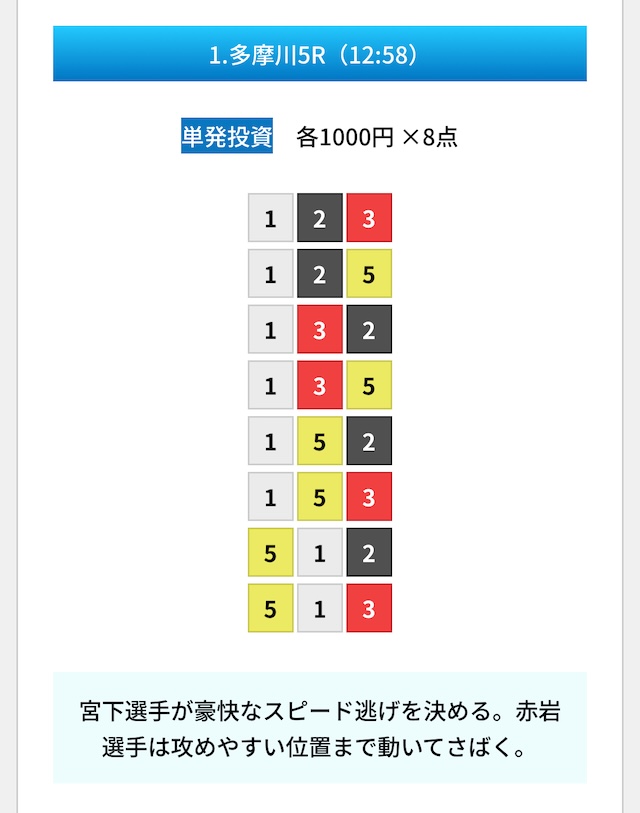 | 9月11日 |  多摩川5R |  三連単 |  8点 |  8,500円  |