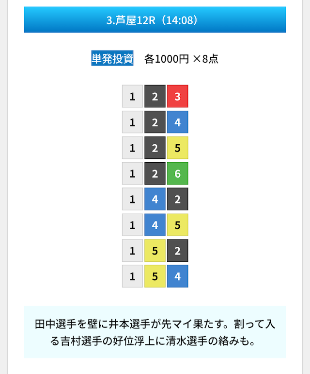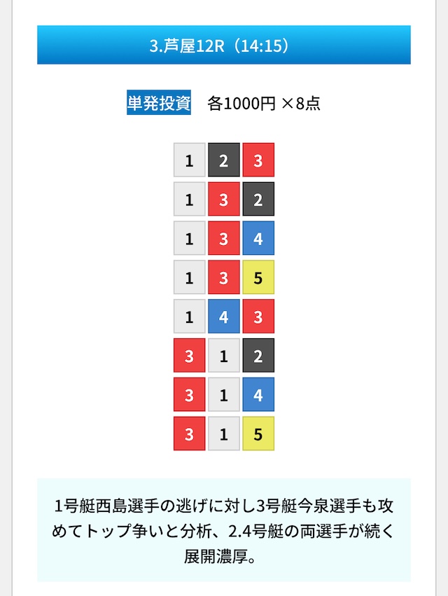 | 9月2日 |  芦屋12R |  三連単 |  8点 |  23,800円  |