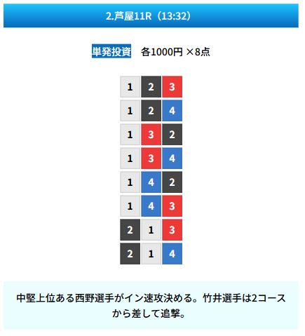 | 8月30日 |  芦屋10R |  三連単 |  8点 |  22,300円  |