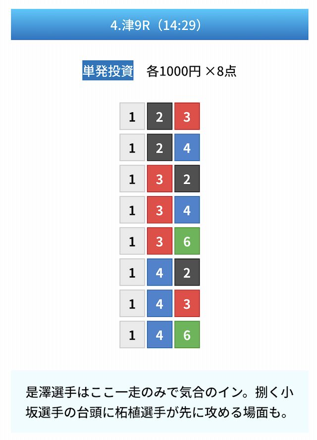 | 8月29日 |  三国12R |  三連単 |  8点 |  29,400円  |