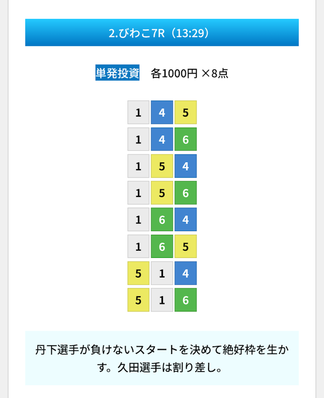 | 9月27日 |  びわこ7R |  三連単 |  8点 |  13,000円  |