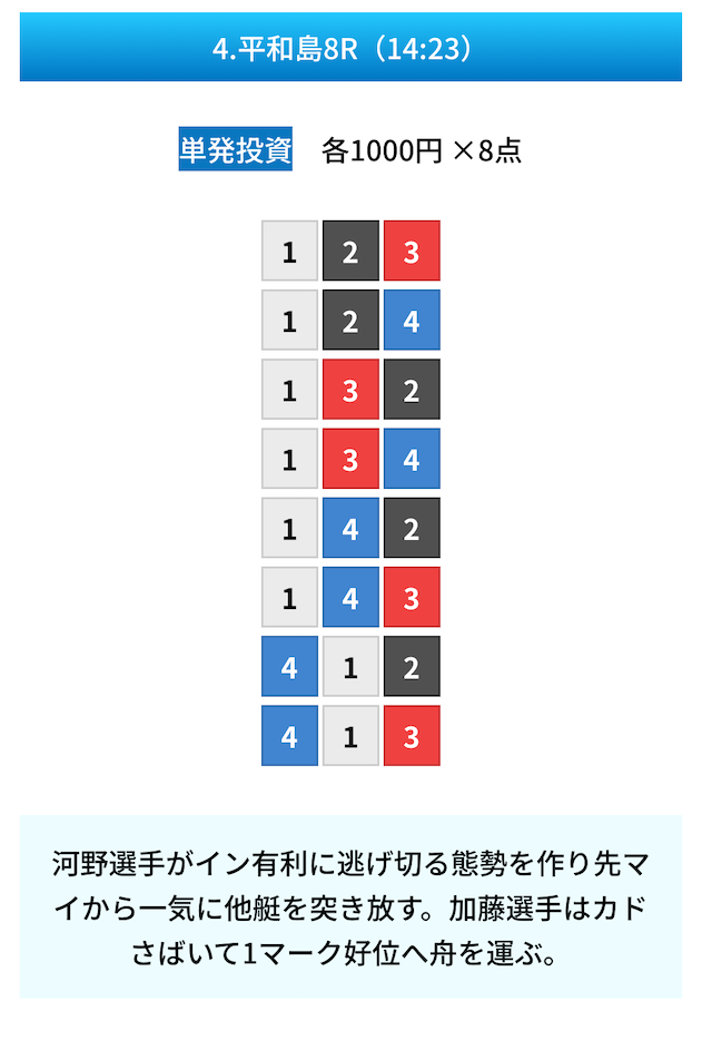 | 8月8日 |  宮島7R |  三連単 |  8点 |  9,600円  |