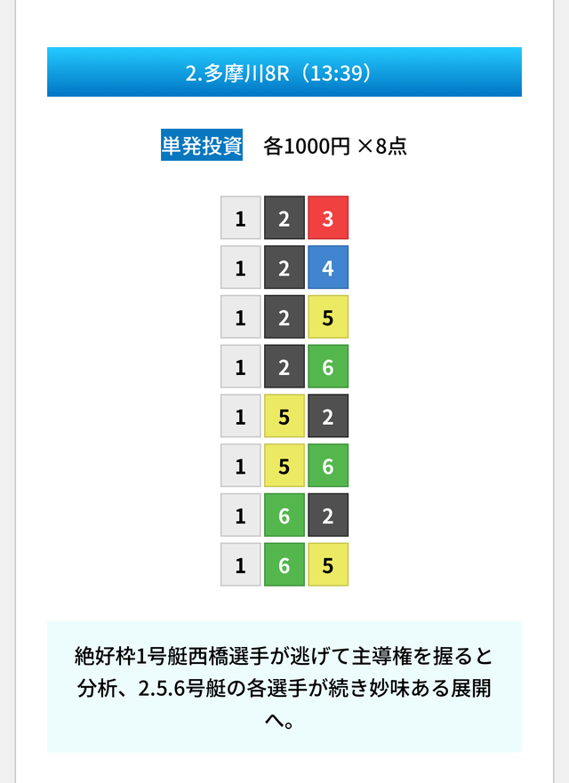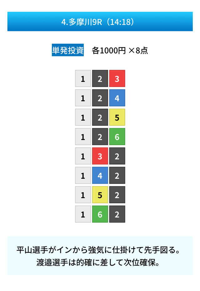 | 9月11日 | 多摩川5R | 三連単 | 8点 | 8,500円 |