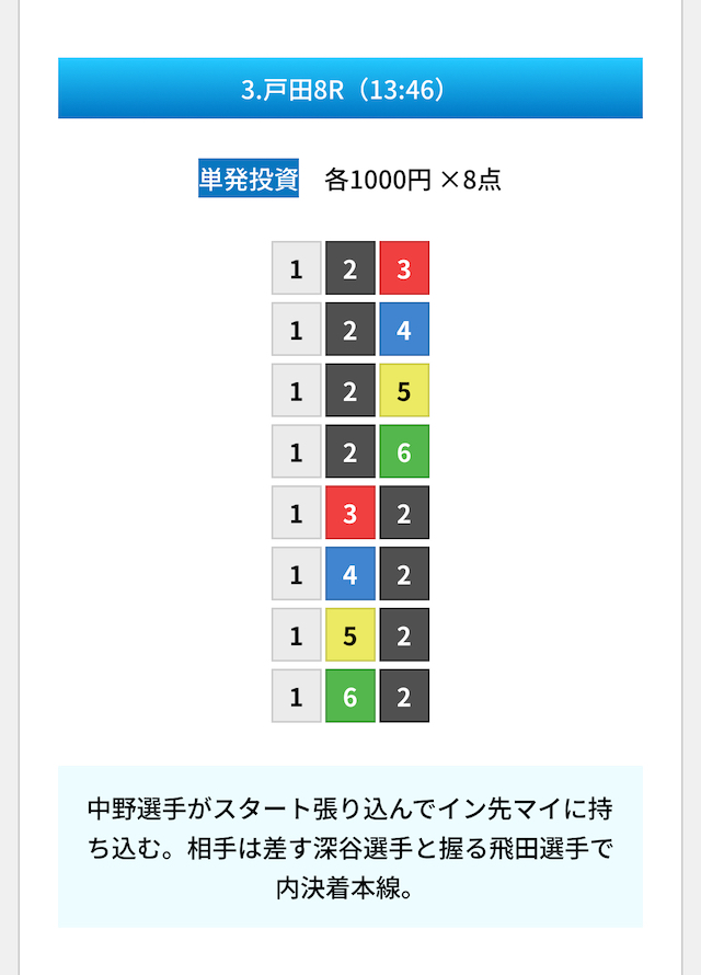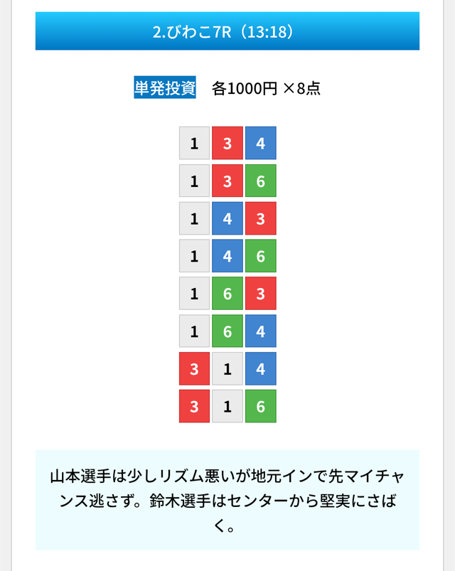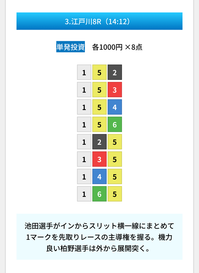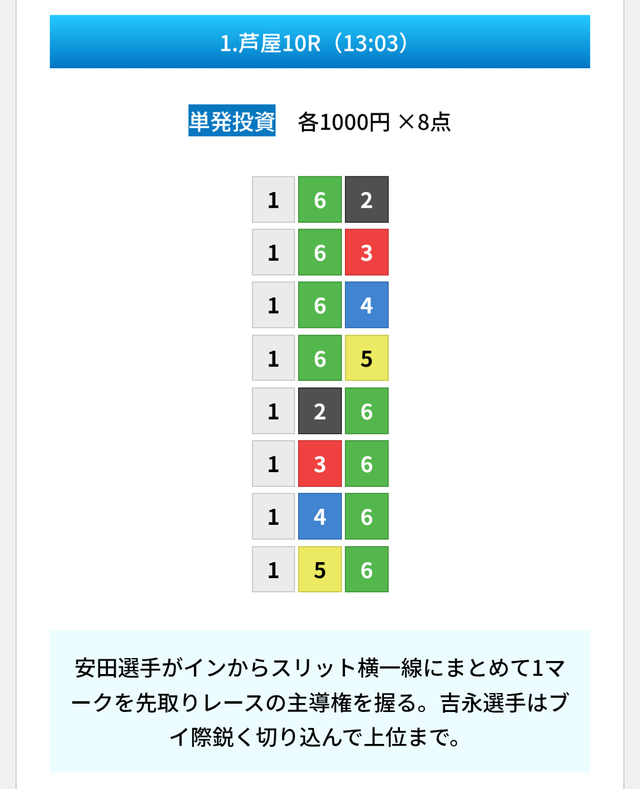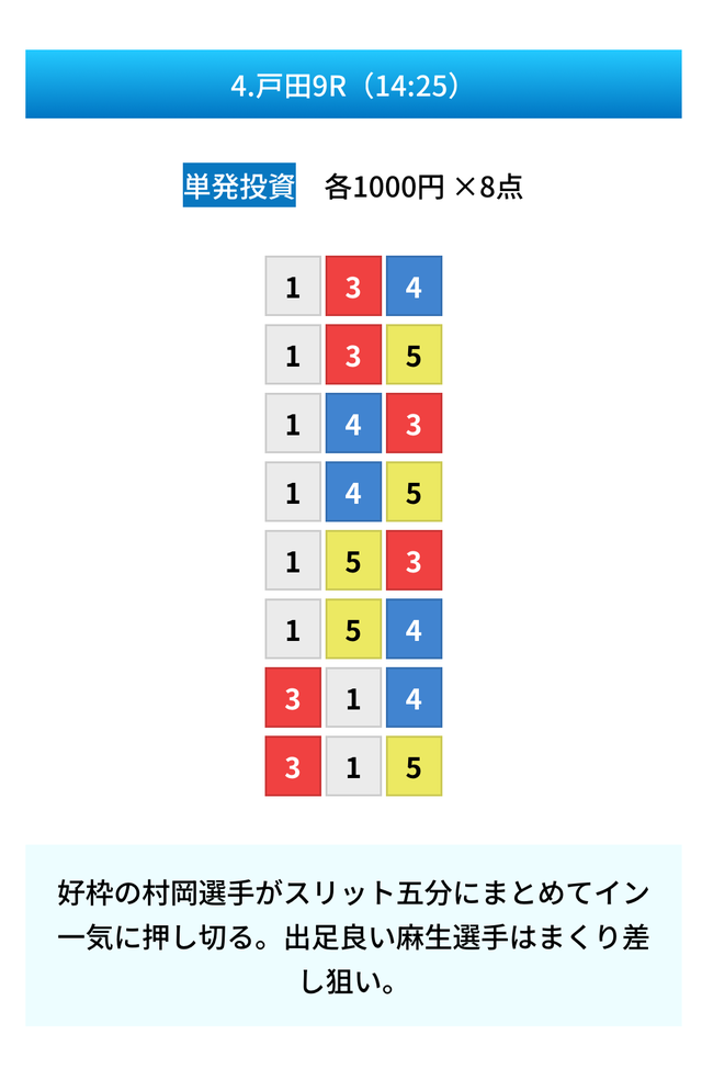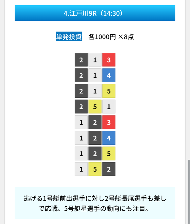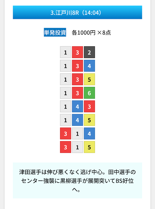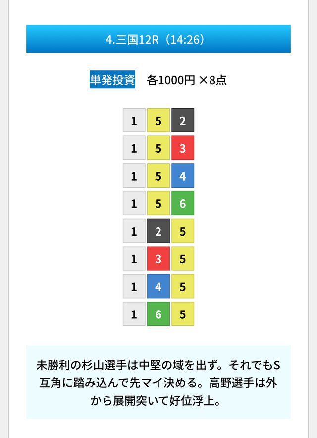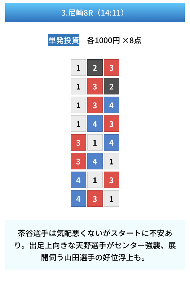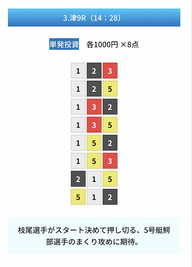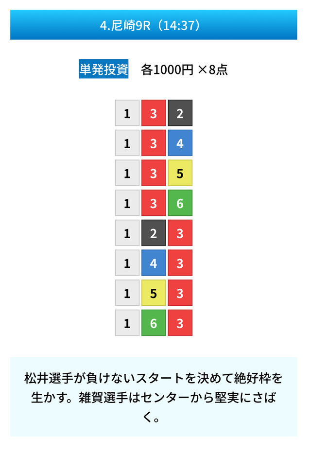 | 9月16日 | 三国12R | 三連単 | 8点 | 8,500円 |