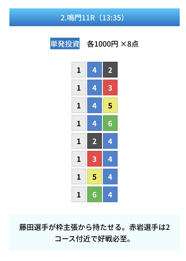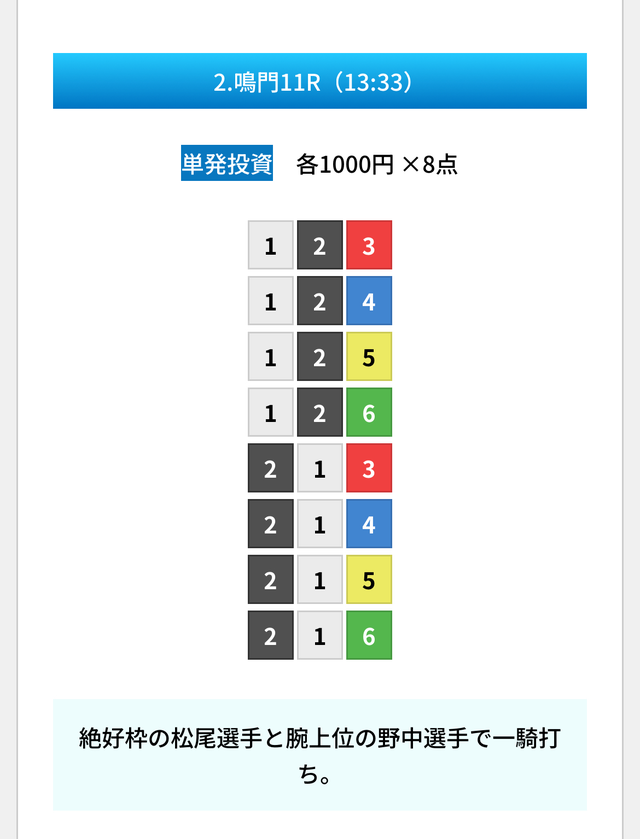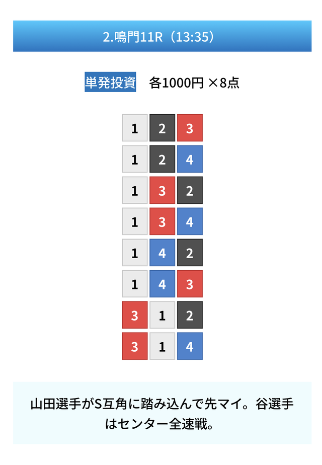 | 11月27日 | 鳴門11R | 三連単 | 8点 | 48,500円 |