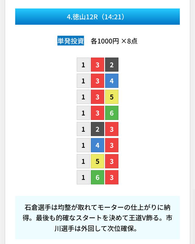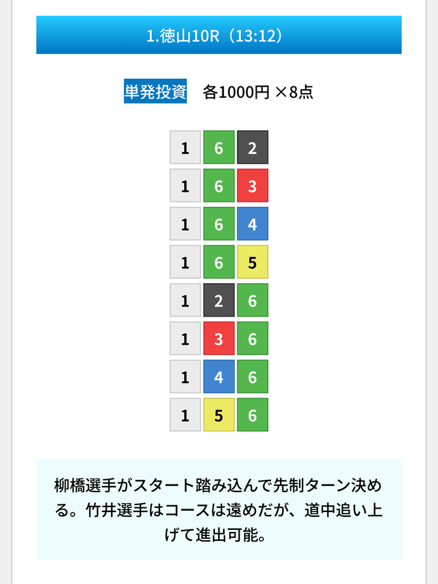 | 10月6日 | 徳山12R | 三連単 | 8点 | 20,600円 |