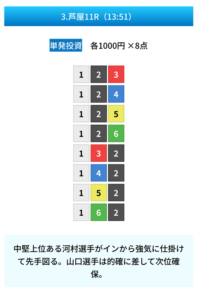 | 11月18日 | 芦屋11R | 三連単 | 8点 | 51,600円 |