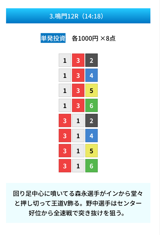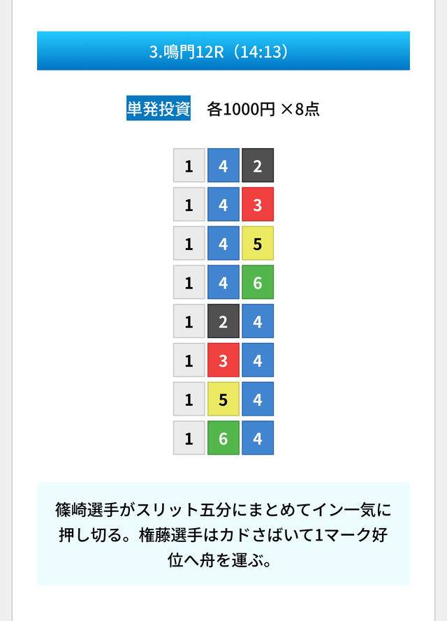 | 12月10日 | 鳴門12R | 三連単 | 8点 | 18,300円 |