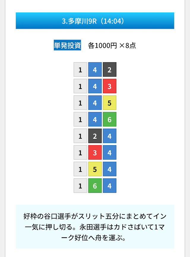 | 11月14日 | 多摩川9R | 三連単 | 8点 | 13,100円 |