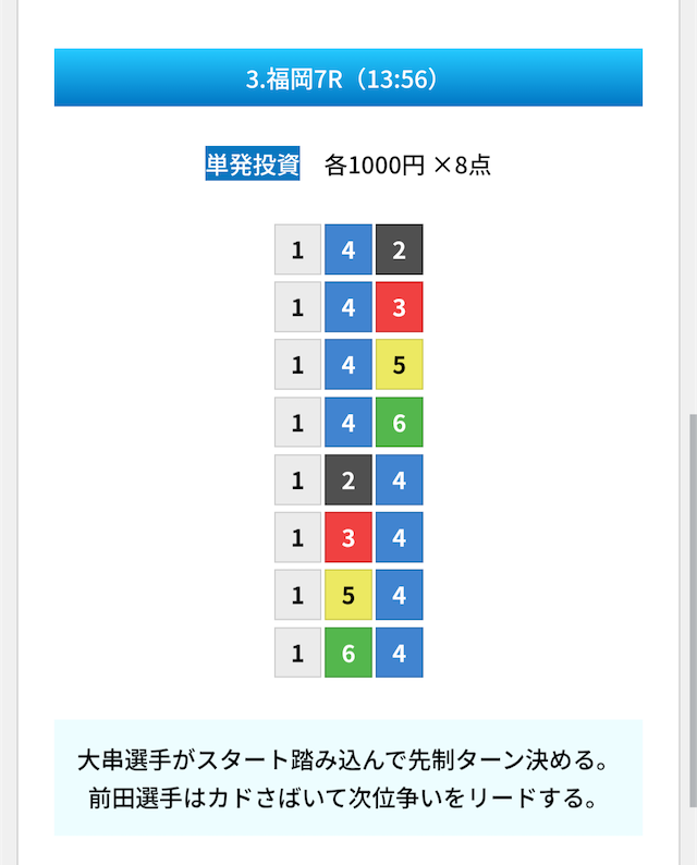 | 10月23日 | 福岡5R | 三連単 | 8点 | 13,500円 |