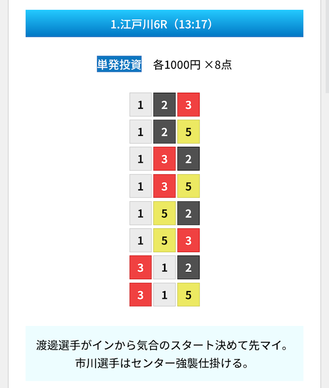 | 11月16日 | 江戸川6R | 三連単 | 8点 | 12,500円 |