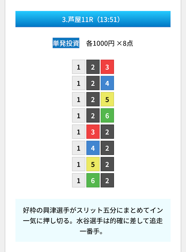 | 9月2日 | 芦屋12R | 三連単 | 8点 | 23,800円 |