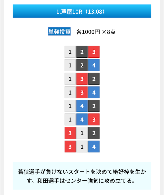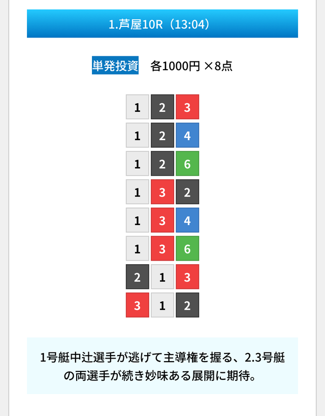 | 10月22日 | 三国12R | 三連単 | 8点 | 8,200円 |