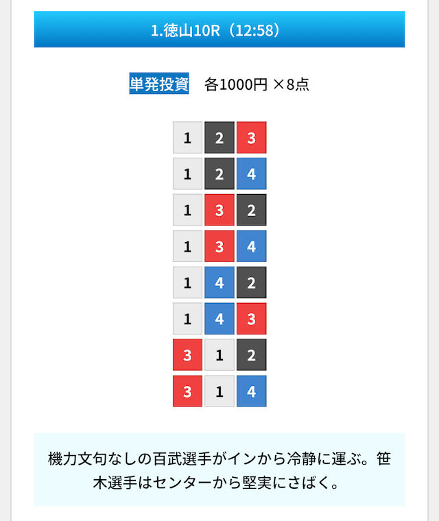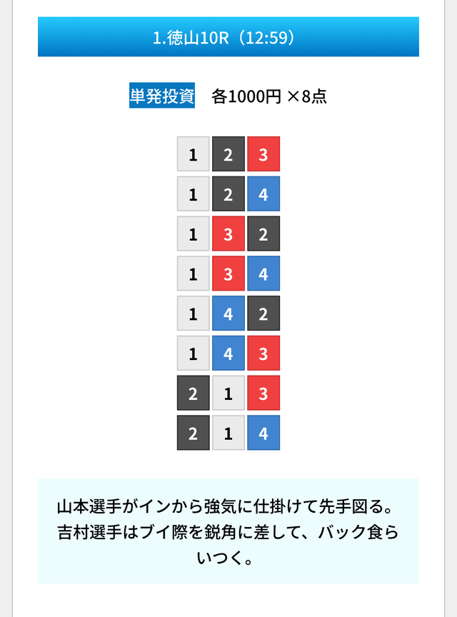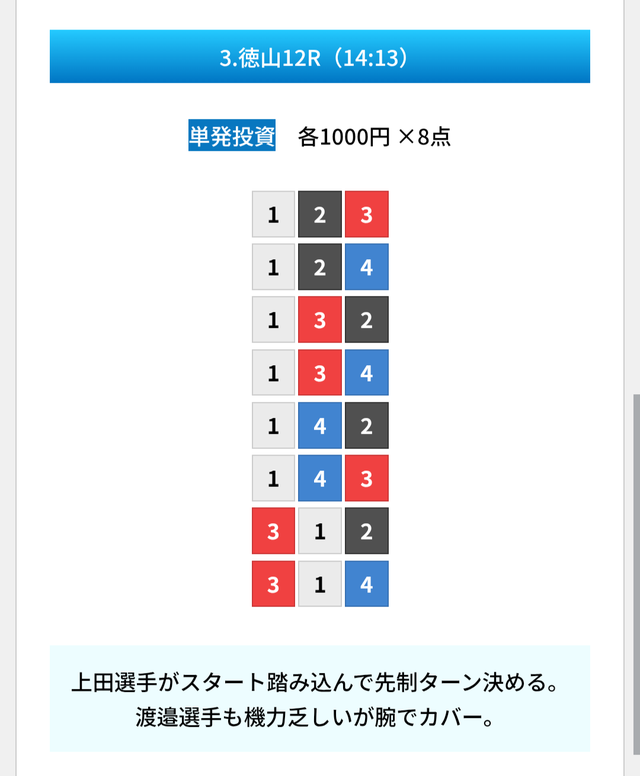 | 12月14日 | 徳山10R | 三連単 | 8点 | 11,900円 |
