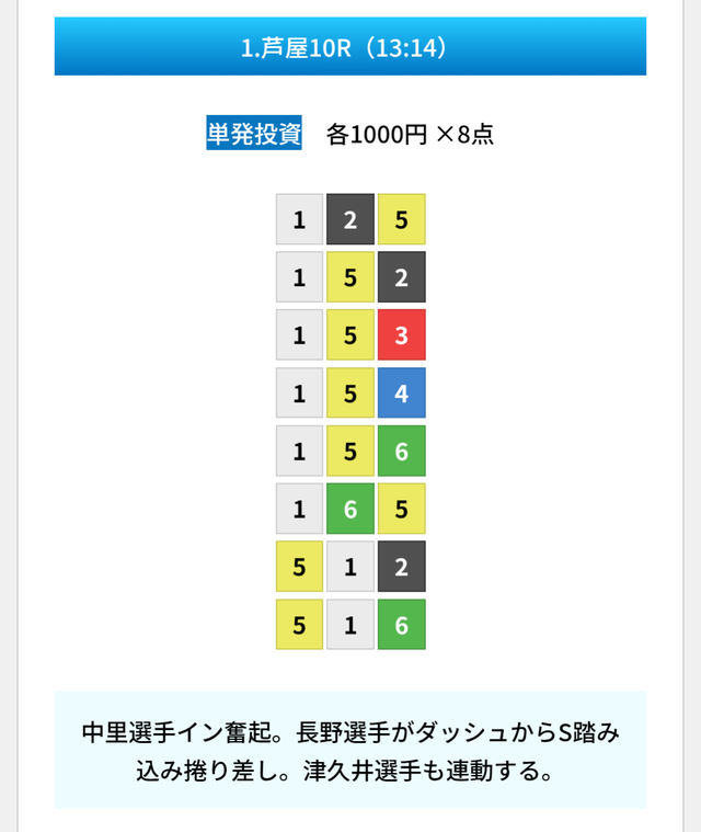| 9月13日 | 芦屋12R | 三連単 | 8点 | 12,400円 |