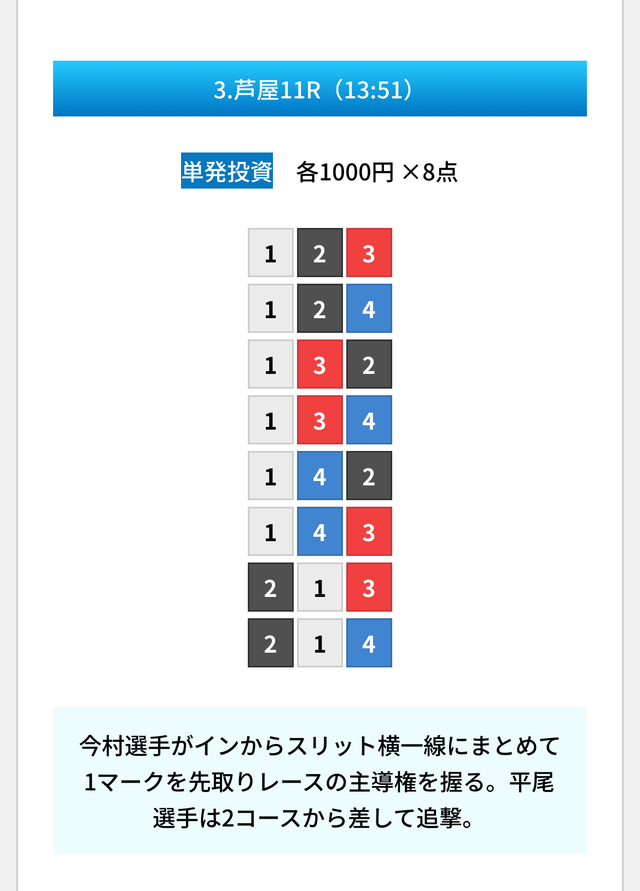| 12月3日 | 芦屋11R | 三連単 | 8点 | 17,300円 |