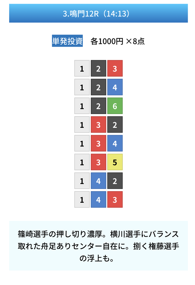 | 11月19日 | 鳴門12R | 三連単 | 8点 | 10,800円 |