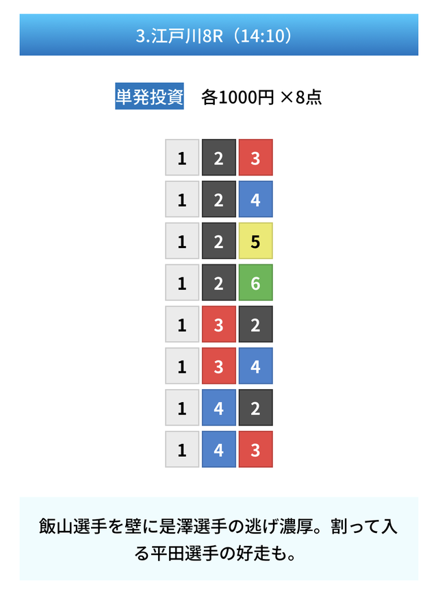 | 11月8日 | 江戸川9R | 三連単 | 8点 | 14,000円 |