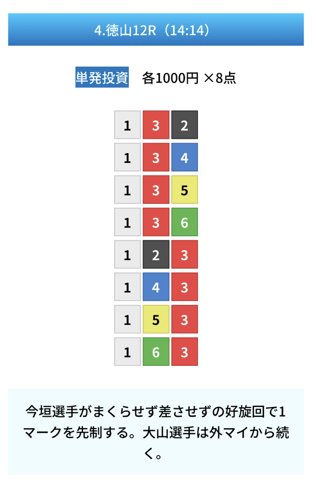 | 1月4日 | 徳山12R | 三連単 | 8点 | 12,800円 |