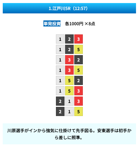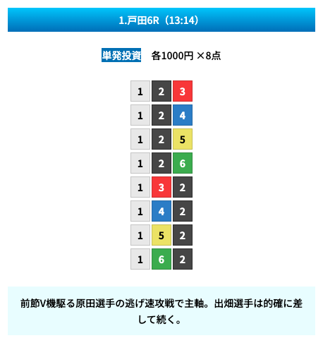 | 1月6日 | 戸田7R | 三連単 | 8点 | 8,500円 |