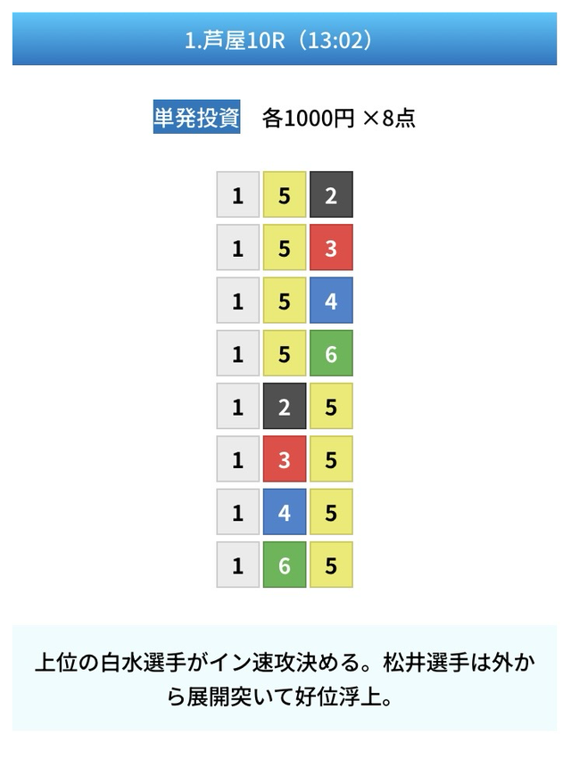 | 10月28日 | 芦屋10R | 三連単 | 8点 | 14,600円 |