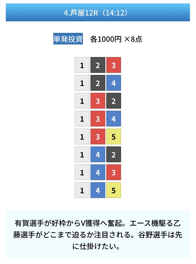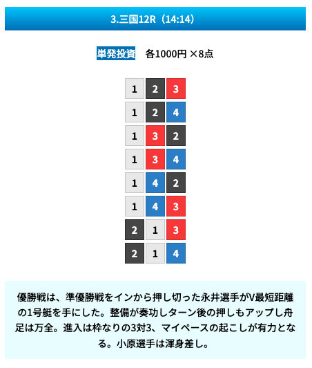 | 1月3日 | 三国12R | 三連単 | 8点 | 14,700円 |